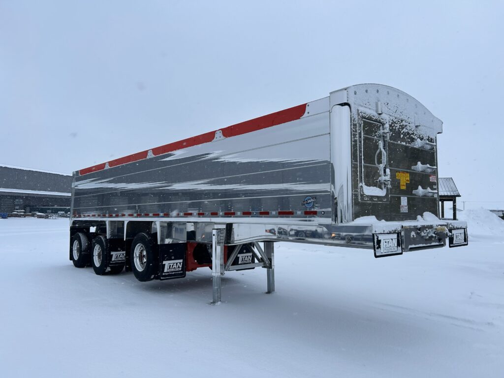 Description: New Titan Tri-Axle Gravel Dump, frame 35′, box 24′ long, 50″ aluminum walls + 8″ board, polished walls and frame on some models, air operated tailgate, electric mesh tarp & liner